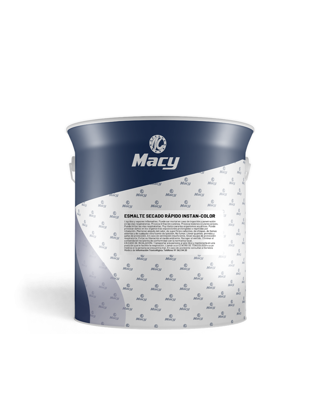 Embalaje: 1x15L, 2x4 L., 6x750 ml. Rendimiento / Mano: 7-12 m²/L. Según color. Fondear con: Hierro: Imprimación Sintética Macy. Para otras superficies: consultar dpto. técnico. Uso y propiedades: Industrial. Secado rápido. Peso específico: 0,95 - 1,20 Kg/L. Según base. Secado: Al tacto: 10-15 min. Total: 25-30 min. Repintado: 3-6 h. ó 5 días. Dilución: Disolvente 209. *: 5%, **: 7%, ***: 10%.